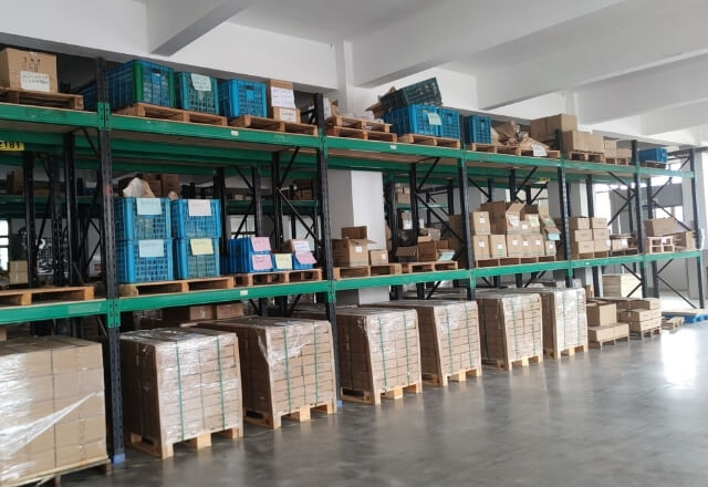 All products are packaged, boxed, labeled with shipping information, and stored in the warehouse awaiting transportation.